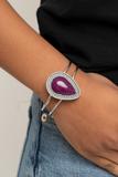 A teardrop purple stone is pressed into the center of a layered silver cuff dotted...