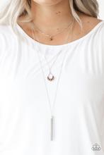 Infused with a lengthened silver chain, a faceted crystal-like bead, an oversized pearly brown bead,...