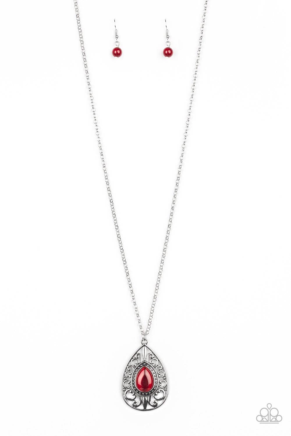 A glowing red moonstone is pressed into the center of a silver teardrop pendant swirling...