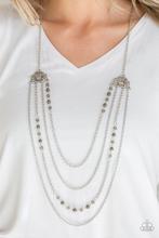An array of polished gray beads, silver discs, and ornate silver accents trickles along a...