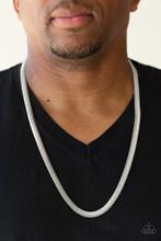 Featuring a high-sheen finish, a thick silver herringbone chain drapes across the chest for a...