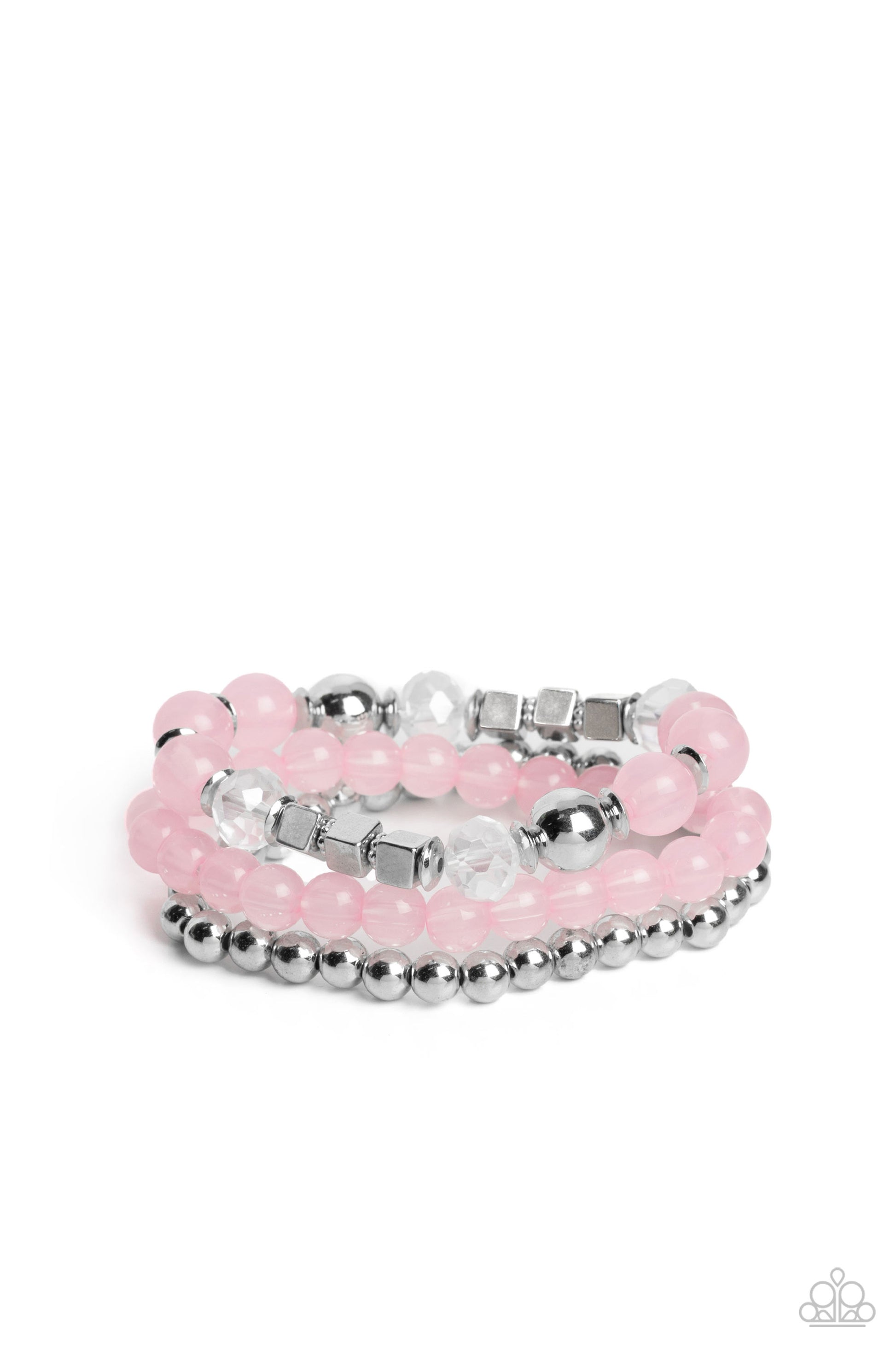 Varying in shape and size, shiny silver beads, silver cube beads, silver accents, baby pink opaque beads, and reflective crystal-like beads are threaded along elastic stretchy bands, creating colorful layers across the wrist.