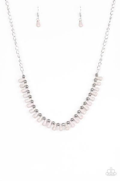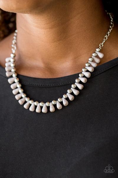 Gray teardrop stones and classic silver beads are threaded along an invisible wire. The earthy beads alternate below the collar, creating a wild fringe. Features an adjustable clasp closure.