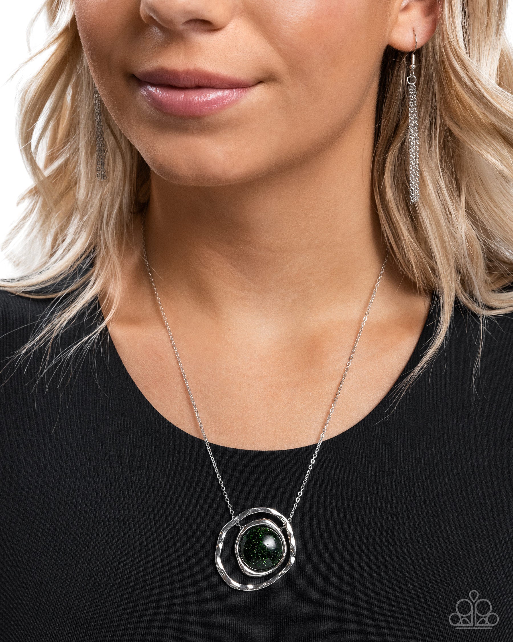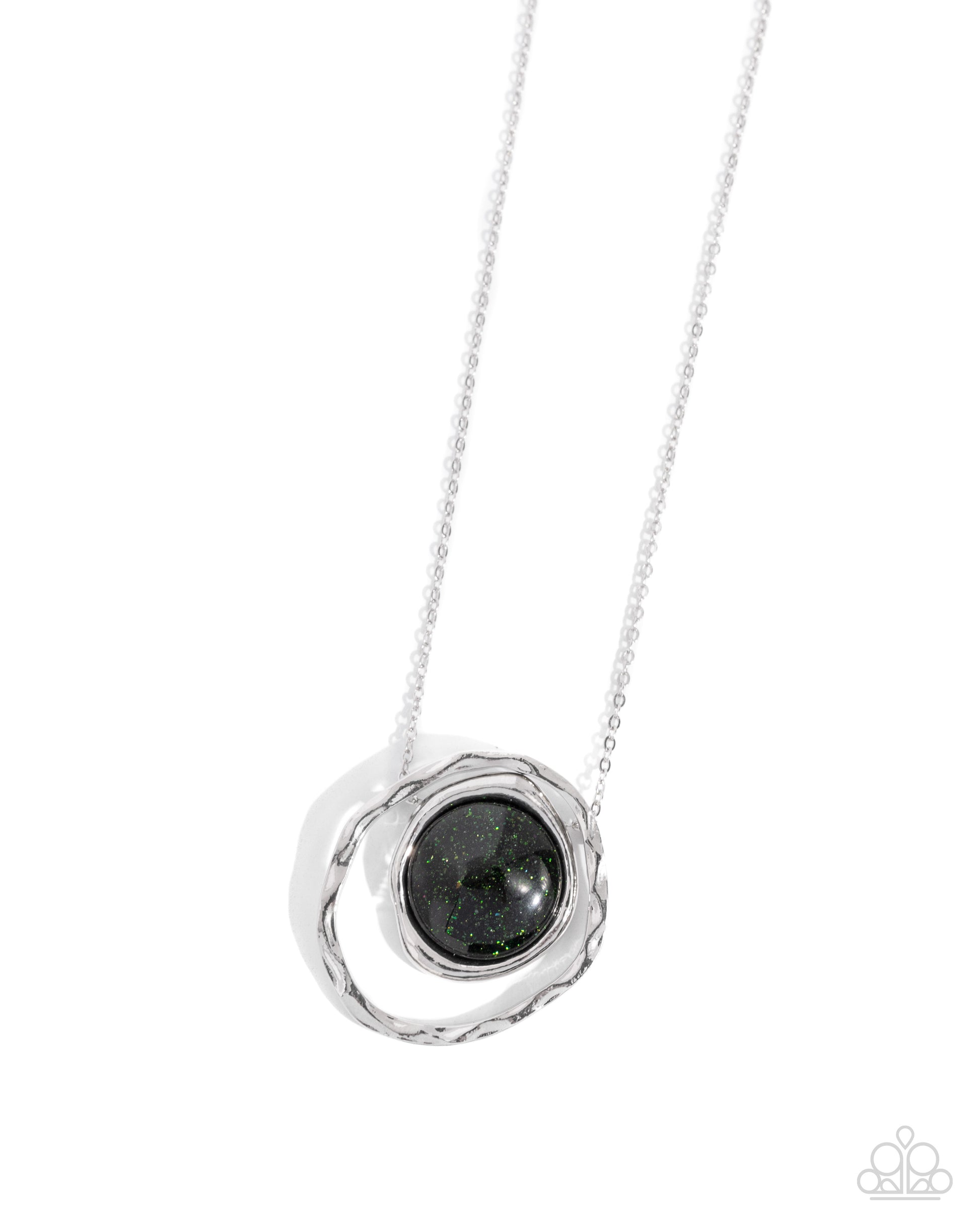 Suspended along the center of an oversized, warped, hammered silver hoop, a green goldstone pendant, pressed in a smaller warped silver frame glides along a dainty silver chain for a glamorously gentle look. Features an adjustable clasp closure. As the stone elements in this piece are natural, some color variation is normal.