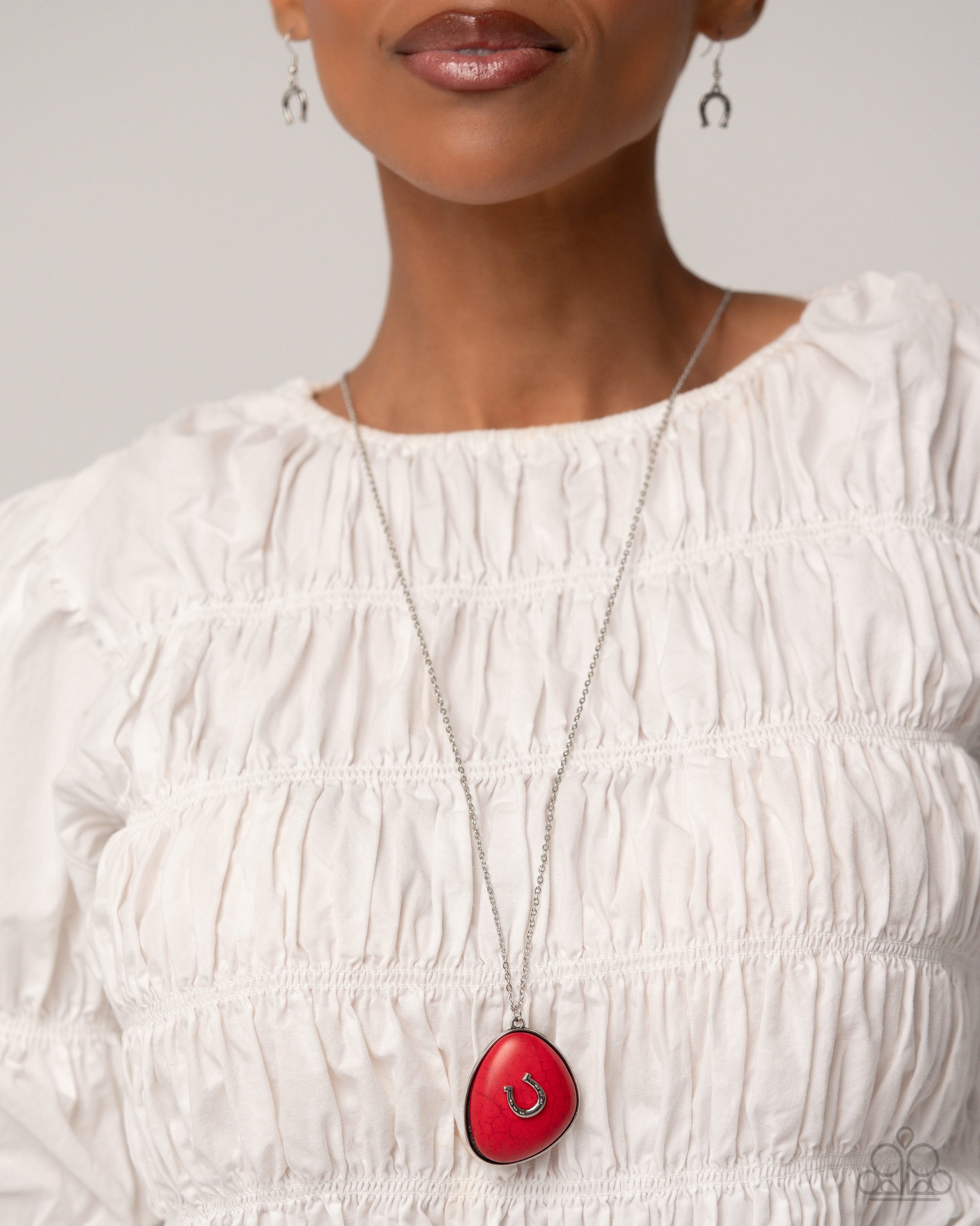 Pressed in an abstract silver frame, a red stone with a silver horseshoe at its center glides along a dainty silver cable chain for a Southwestern-inspired display. Features an adjustable clasp closure. As the stone elements in this piece are natural, some color variation is normal.