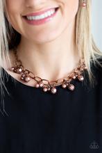 Varying in size, a collection of faceted copper and pearly copper beads swing from a bold copper chain, creating a whimsical metallic fringe below the collar. Features an adjustable clasp closure.