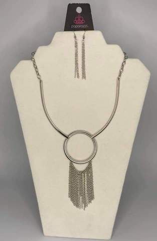 Attached to two bowing shiny silver bars, a shiny silver hoop gives way to a matching chain fringe, creating a statement-making look below the collar. Features an adjustable clasp closure.