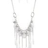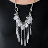 Shiny silver beads and faceted cloudy teardrops drip from the bottom of a shimmery silver chain below the collar. Flared cloudy beading swings from the bottoms of free-falling silver chains, creating a vivacious fringe. Features an adjustable clasp closure.