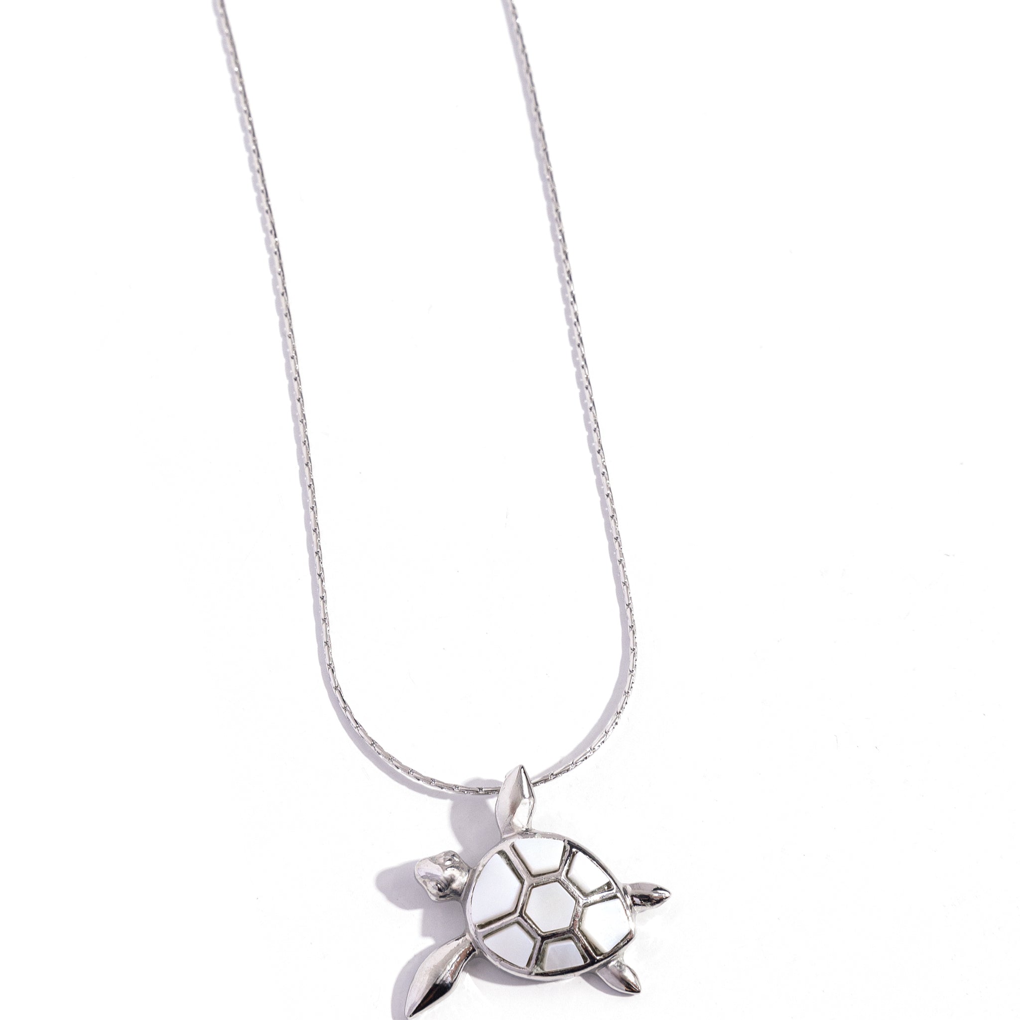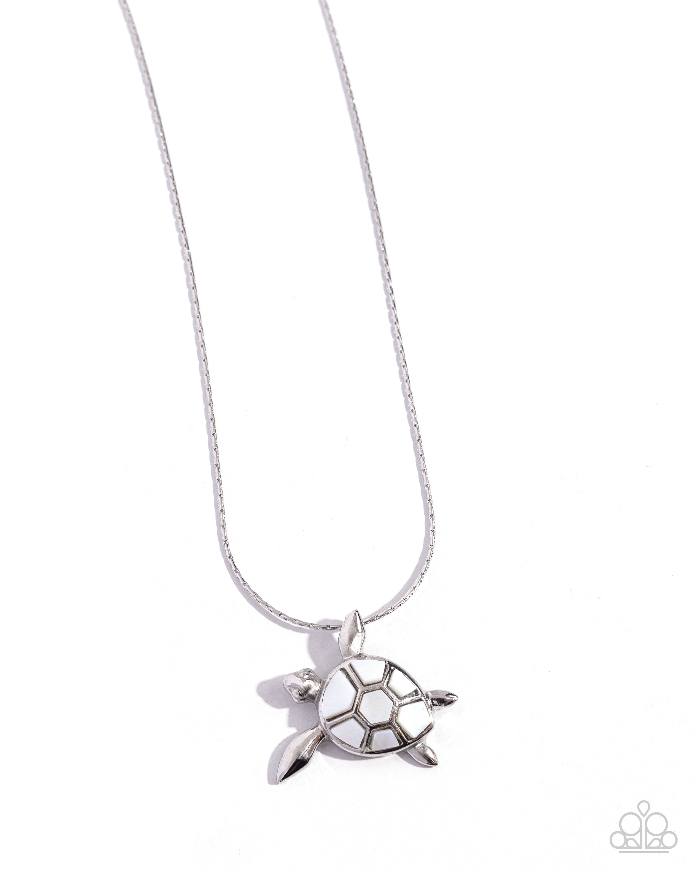 Featuring chiseled pieces of white shell, a silver sea turtle charm swims along a dainty silver chain below the neckline from one of its glistening silver fins for a tilted tidal look. Features an adjustable clasp closure.