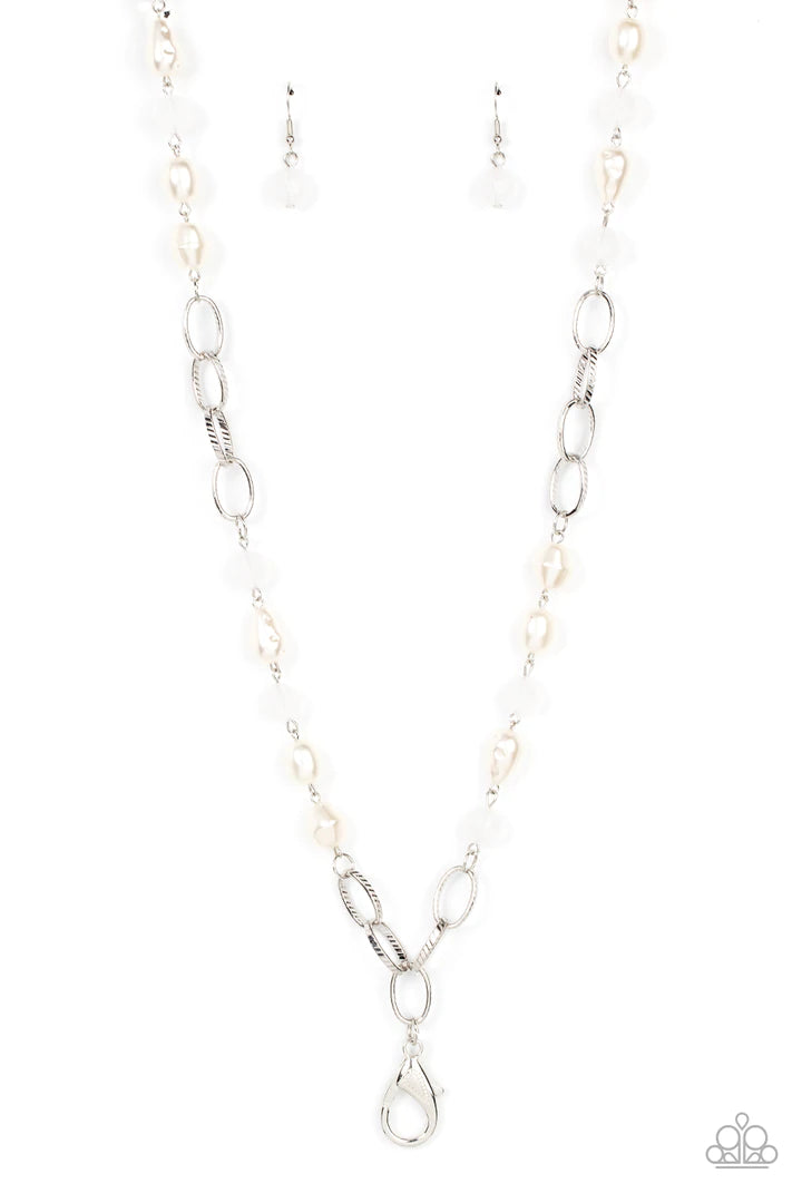 Featuring imperfect shapes, luscious pearly beads join opaque white faceted beads along sections of chunky silver chain across the chest for a glamorous look. Features an adjustable clasp closure.