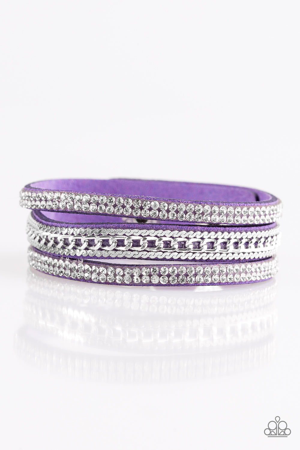 Glassy white rhinestones and shimmery silver chains are encrusted along strands of purple suede, creating a mishmash of sassy shimmer around the wrist for a fierce look. Features an adjustable snap closure.
