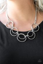 Doubled silver hoops link below the collar for a bold industrial look. Features an adjustable clasp closure.