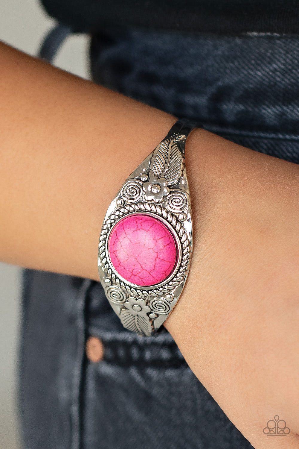 An oversized pink stone is pressed into the center of a dainty silver cuff abloom with leafy floral accents, creating an earthy centerpiece around the wrist.